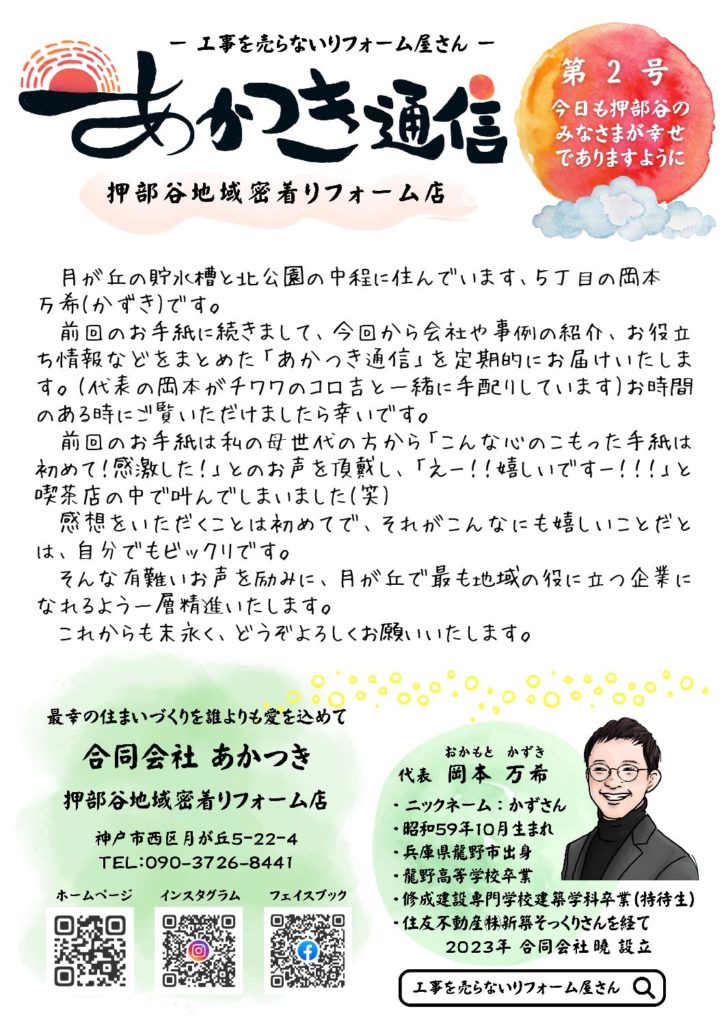 そんな想いで地域に配布を始めたあかつき通信の第2号を2025年9月から1件1件手配りで配布し始めました。